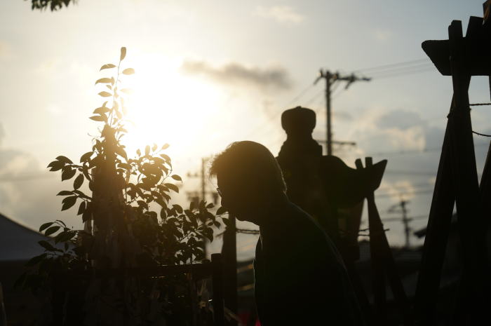 朝日を浴びて神送祭の支度