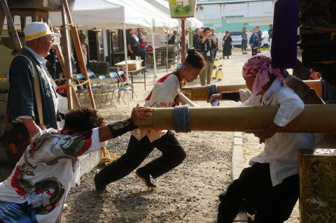 大屋根・梵天を上げ、からくり人形奉納の支度をします